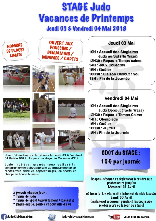Il vous faudra prévoir un pique-nique, un goûter, une bouteille d'eau, ainsi que le kimono et un survêtement pour le sport collectif.